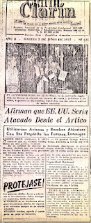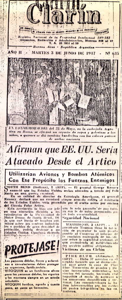 “AFIRMAN QUE EE.UU. SERÍA ATACADO DESDE EL ÁRTICO. Utilizarían aviones y bombas atómicas con ese propósito las fuerzas enemigas-Short Venid (Indiana), 2, AFP-El general Jorge Kenney anunció que los EE.UU. serían atacados a través del Polo Norte en una guerra eventual. En su calidad de director de Estrategia Americana, el general Kenney declaró que un eventual ataque armado contra el territorio de los EE.UU. sería precedido por el asalto aéreo por encima del Círculo Polar Ártico. Esta revelación la hizo ese jefe en una alocución dirigida a los estudiantes de la Universidad de Notre Dame, de Souh Bend.