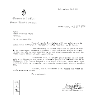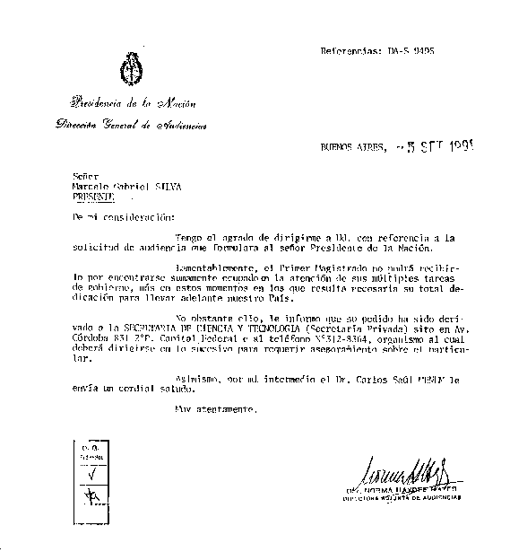 c) La respuesta de la directora de audiencias de la Presidencia de la Nación, a cuyo titular, Dr. Carlos Menem, fue girada una carpeta-legajo solicitando medios, exponiendo especificaciones técnicas y humanas además de presupuestarias, para realizar el Gran Viaje al Mundo Subterráneo, contactando con los habitantes del mismo, ingresando por la abertura polar Sur. No se halló eco. El titular de este hecho es un investigador argentino, Marcelo Gabriel Silva.(Nota DA5-9495 del 5/9/91).