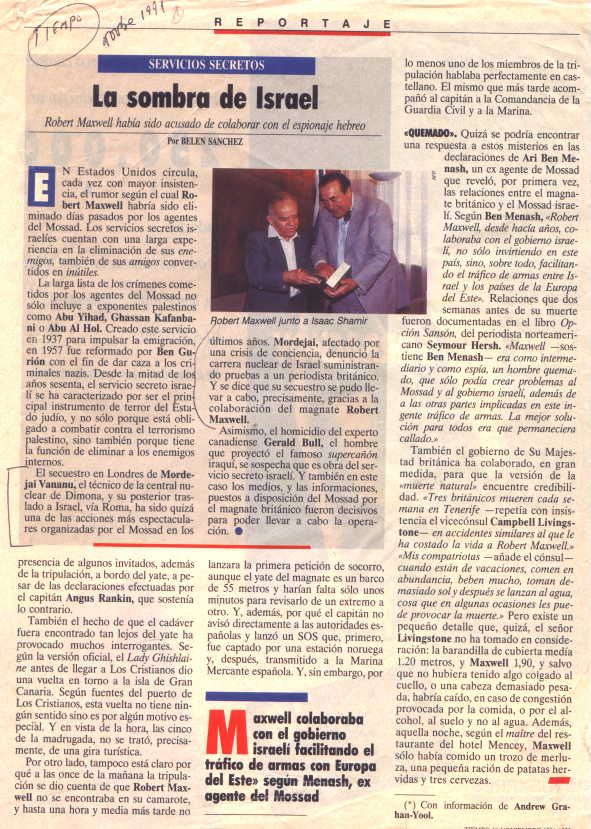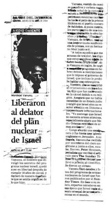 El caso de Mordejai Vanunu es realmente impresionante, por su entramado de encubrimientos y asesinatos. Además de la cita que nace, para nosotros, del diario argentino “Clarín” de fecha 30-12-86, originada de un cable de Pretoria, Sudáfrica, del 29-l2-86 (agencias UPI y TASS), ya en la revista TIEMPO de noviembre de 1991 la periodista Belén Sánchez hace hincapié en un sujeto tenebroso, Robert Maxwell, estafador en 700.000.000 de dólares de una recaudadora privada de fondos provisionales de su propiedad en los EE.UU.; se lo sindica también como colaborador del gobierno israelí en el tráfico de armas, etc, etc.