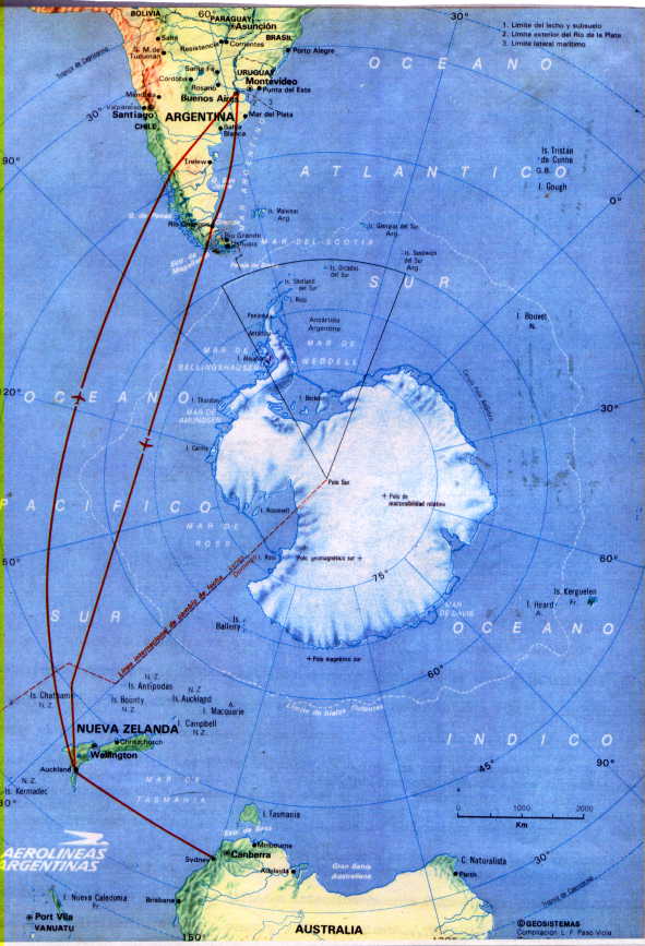 Mapa levantado de la página 93 de la Edición Nº 32 de la revista oficial de Aerolíneas Argentinas, “EN VUELO”, de julio-agosto-septiembre de 1991, donde se muestra claramente que el vuelo transpolar no existe, circunstancia ya señalada por el autor de este libro en la página Nº 166 de su obra “Las Pruebas Materiales de la Tierra Hueca” (1ra. edición, diciembre de 1987).